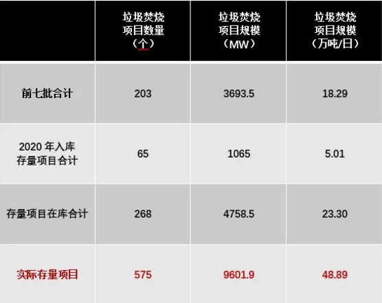 可再生能源發(fā)電項(xiàng)目“存量”、“新增”以2020年1月20日為界進(jìn)行劃分。存量項(xiàng)目中已在原有目錄內(nèi)的(前七批),直接進(jìn)入新目錄,并按原有規(guī)則進(jìn)行補(bǔ)貼。據(jù)E20研究院數(shù)據(jù)統(tǒng)計(jì),符合條件的存量項(xiàng)目合計(jì)575個(gè),涉及處理能力48.89萬噸/日。而截至2020年底進(jìn)入目錄的共有268個(gè)項(xiàng)目,涉及處理能力23.30萬噸/日。
