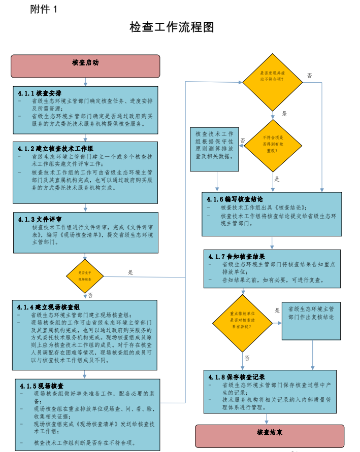 核查程序包括核查安排、建立核查技術(shù)工作組、文件評(píng)審、建立現(xiàn)場(chǎng)核查組、實(shí)施現(xiàn)場(chǎng)核查、出具《核查結(jié)論》、告知核查結(jié)果、存核查記錄等八個(gè)步驟,核查工作流程圖見(jiàn)附件1。
