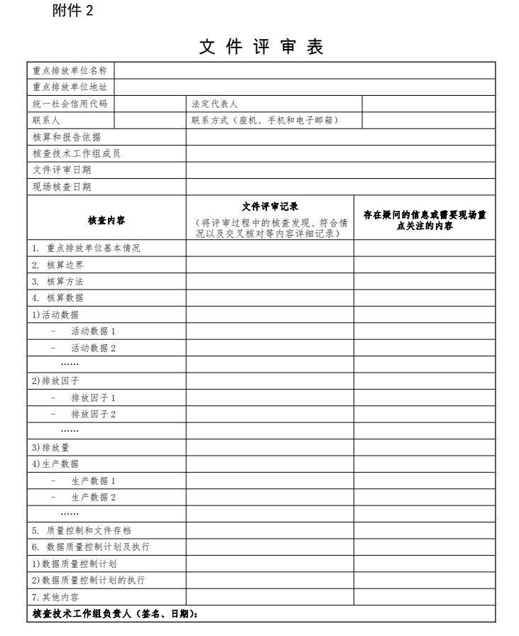 技術(shù)工作組應(yīng)根據(jù)相應(yīng)行業(yè)的溫室氣體排放核算方法與報(bào)告指南(以下簡(jiǎn)稱(chēng)核算指南)、相關(guān)技術(shù)規(guī)范,對(duì)重點(diǎn)排放單位提交的排放報(bào)告及數(shù)據(jù)質(zhì)量控制計(jì)劃等支撐材料進(jìn)行文件評(píng)審,初步確認(rèn)重點(diǎn)排放單位的溫室氣體排放量和相關(guān)信息的符合情況,識(shí)別現(xiàn)場(chǎng)核查重點(diǎn),提出現(xiàn)場(chǎng)核查時(shí)間、需訪(fǎng)問(wèn)的人員、需觀(guān)察的設(shè)施、設(shè)備或操作以及需查閱的支撐文件等現(xiàn)場(chǎng)核查要求,并按附件2和附件3的格式分別填寫(xiě)完成《文件評(píng)審表》和《現(xiàn)場(chǎng)核查清單》提交省級(jí)生態(tài)環(huán)境主管部門(mén)。