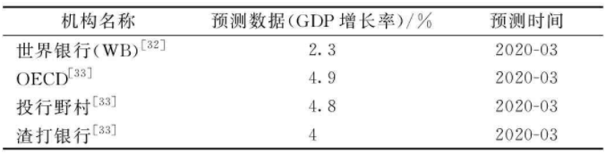 1)人口。2018—2019年上海市常住人口數(shù)據(jù)來自《2018年上海市國民經(jīng)濟和社會發(fā)展統(tǒng)計公報》《2019年上海市國民經(jīng)濟和社會發(fā)展統(tǒng)計公報》,2020—2035年人口增長率來自聯(lián)合國人口預測。2)經(jīng)濟情況。2018—2019年上海市GDP數(shù)據(jù)來自《2018年上海市國民經(jīng)濟和社會發(fā)展統(tǒng)計公報》《2019年上海市國民經(jīng)濟和社會發(fā)展統(tǒng)計公報》;鑒于2020年新型冠狀病毒疫情對中國各省市經(jīng)濟活動造成一定程度的影響,根據(jù)不同研究機構(gòu)的預測(表3),綜合我國經(jīng)濟結(jié)構(gòu)實際情況,最終確定中國2020年GDP增速為4.5%,上海市2020年GDP增長率為4.5%。表3 各機構(gòu)對2020年中國經(jīng)濟的預測