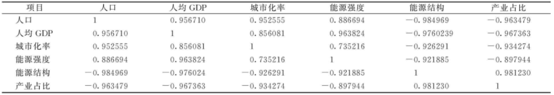 原始指標的Pearson相關(guān)系數(shù)矩陣如表4所示??梢钥闯?,大部分指標之間存在高度相關(guān)性。其中,人均GDP和人口數(shù)的相關(guān)系數(shù)高達0.96,城市化率與能源強度和人口之間的相關(guān)系數(shù)絕對值也超過0.86。由于各個變量之間的相關(guān)性較強,可以使用主成分分析提取主成分。