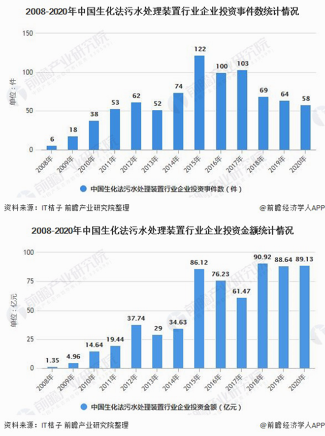 根據(jù)IT桔子的數(shù)據(jù)顯示,2008-2020年生化法污水處理裝置行業(yè)企業(yè)投資事件呈現(xiàn)波動(dòng)趨勢(shì)。在2015年,中國(guó)生化法污水處理裝置行業(yè)企業(yè)投資事件達(dá)到近年來(lái)峰值122件,但投資金額為86.12億元。從投資金額角度來(lái)看,在2018年,生化法污水處理裝置行業(yè)企業(yè)投資達(dá)到了近年來(lái)峰值90.92億元。