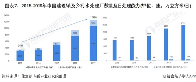 自2015年以來,我國(guó)農(nóng)村污水廠數(shù)量飛速增長(zhǎng),污水處理能力穩(wěn)步提升,建設(shè)鎮(zhèn)及鄉(xiāng)污水處理廠數(shù)量由2015年的3437座增長(zhǎng)至2019年的12480座,增速高達(dá)三倍左右。截止2019年底,我國(guó)建設(shè)鎮(zhèn)及鄉(xiāng)污水日處理能力分別達(dá)到了2477萬立方米/日和109萬立方米/日。
