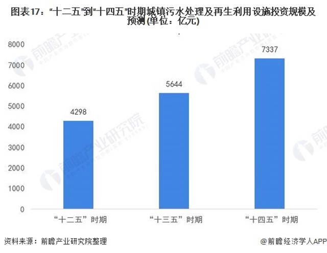 根據(jù)“十三五”規(guī)劃中針對(duì)水環(huán)境治理領(lǐng)域的投資規(guī)模,同時(shí)結(jié)合新時(shí)期的農(nóng)村水環(huán)境治理與幾大流域生態(tài)治理的工程總量與復(fù)雜程度綜合分析,前瞻判斷“十四五”規(guī)劃中針對(duì)水環(huán)境治理的投資規(guī)模或進(jìn)一步升級(jí)加碼至7337億元。中國(guó)污水處理市場(chǎng)仍有較大發(fā)展空間。
