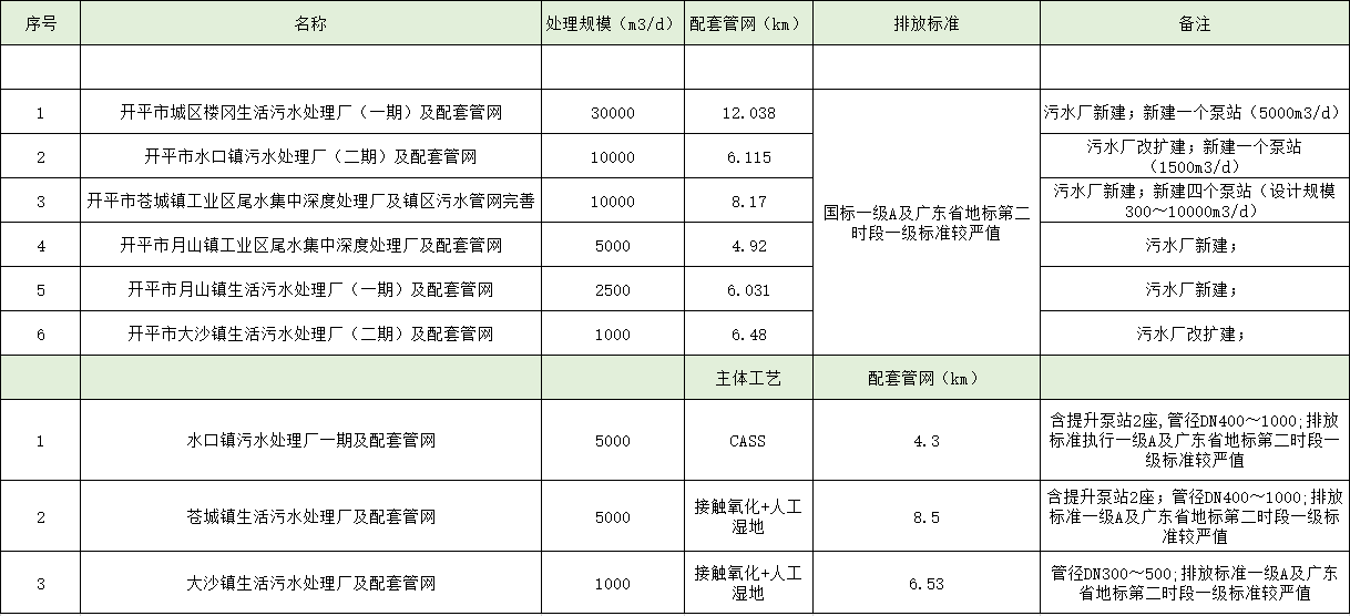新建污水處理設(shè)施由六個子項目構(gòu)成,包括:開平市城區(qū)樓岡生活污水處理廠(一期)及配套管網(wǎng)工程、開平市水口鎮(zhèn)污水處理廠二期及配套管網(wǎng)項目、開平市蒼城鎮(zhèn)工業(yè)區(qū)尾水集中深度處理廠及鎮(zhèn)區(qū)污水管網(wǎng)完善項目、開平市月山鎮(zhèn)工業(yè)區(qū)尾水集中深度處理廠及配套管網(wǎng)工程、開平市月山鎮(zhèn)生活污水處理廠(一期)及配套管網(wǎng)工程、開平市大沙鎮(zhèn)生活污水處理廠二期及配套管網(wǎng)項目