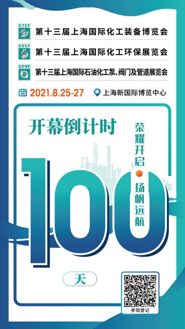 CTEF 2021第十三屆上海國際化工裝備博覽會將于2021年8月25日至27日在上海舉行。5月17日,CTEF 2021倒計時100天。