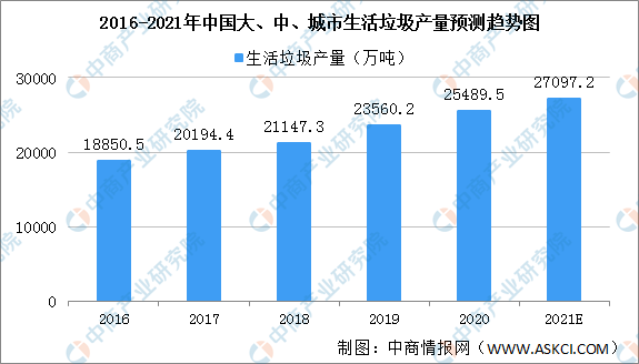 我國(guó)是人口大國(guó),也是垃圾產(chǎn)生大國(guó),且隨著經(jīng)濟(jì)穩(wěn)步發(fā)展、民眾生活消費(fèi)水平、城鎮(zhèn)化率不斷提高,生活垃圾產(chǎn)生量持續(xù)走高。2016年我國(guó)大、中城市生活垃圾產(chǎn)生量18850.5萬(wàn)噸,2019年生活垃圾產(chǎn)生量增至23560.2萬(wàn)噸。預(yù)計(jì)2021年我國(guó)生活垃圾產(chǎn)量27097.2萬(wàn)噸。