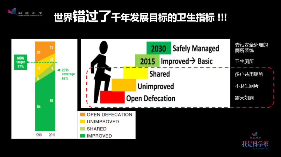 科學(xué)是要有數(shù)據(jù)說話的——這是世界衛(wèi)生組織、聯(lián)合國兒童基金會(huì)提供的數(shù)據(jù),有些國家可能只有10%的人口有衛(wèi)生廁所。當(dāng)然在更發(fā)達(dá)的國家,也有100%的人口都擁有衛(wèi)生廁所。