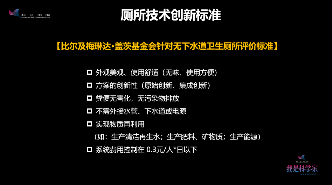 這是蓋茨基金會(huì)針對(duì)新型廁所提出的,從舒適度上、衛(wèi)生安全、資源化、經(jīng)濟(jì)上面提出了一系列的要求。你要?jiǎng)?chuàng)新,但需要滿足這些要求才能夠獲得基金會(huì)的支持。
