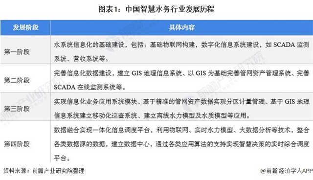 智慧水務是指利用物聯(lián)網(wǎng)、智能傳感、云計算、大數(shù)據(jù)等技術對供水、排水、節(jié)水、污水處理、防洪等水務環(huán)節(jié)進行智慧化管理。我國智慧水務經(jīng)歷了信息化的基礎建設、完善信息化數(shù)據(jù)和應用模塊等建設,行業(yè)正處于第四階段——數(shù)據(jù)融合實現(xiàn)一體化信息調(diào)度平臺階段。