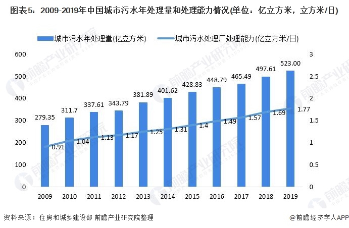 除了供水外,污水處理也是目前水務(wù)行業(yè)重點(diǎn)關(guān)注的領(lǐng)域之一。從污水處理的供給來(lái)看,由于城鎮(zhèn)化和經(jīng)濟(jì)發(fā)展需求,中國(guó)城市近年來(lái)污水產(chǎn)生量和處理量呈上升趨勢(shì)。從城市污水處理情況來(lái)看,截至2019年底,全國(guó)城市污水處理廠處理能力1.77億立方米/日,累計(jì)處理污水量523億立方米。