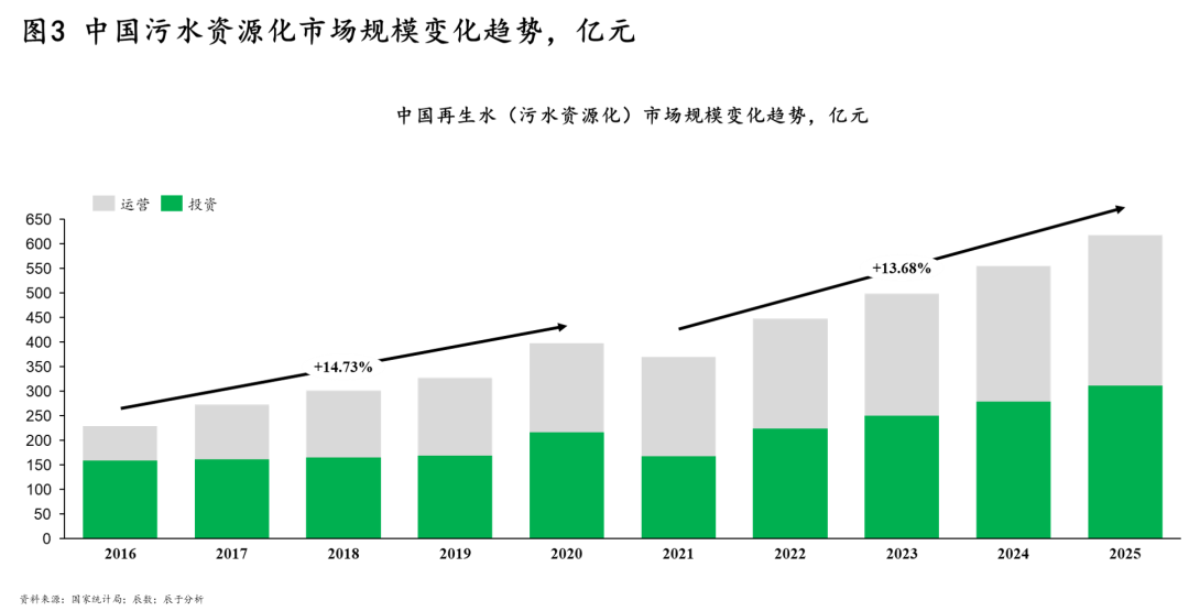 基于以上兩大因素考慮,“十四五”期間污水資源化市場有望迎來快速發(fā)展。經(jīng)辰于測算,2021~2025年,我國污水資源化市場有望實現(xiàn)13.68%的年復合增長,到2025年達到600億元以上的投運規(guī)模(見圖3)。