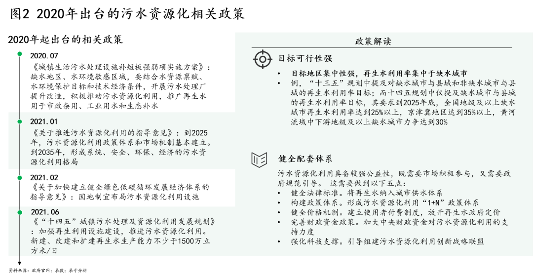 二是可操作性強的政策密集出臺。2020年以來,連續(xù)出臺了《關于推進污水資源化利用的指導意見》、《“十四五”城鎮(zhèn)污水處理及資源化利用發(fā)展規(guī)劃》等重磅政策,這些政策要求的目標可行性更強,例如相比“十三五”規(guī)劃中同時提及缺水城市和非缺水城市的再生水利用率目標,本次規(guī)劃主要集中于缺水城市,針對性更強;與政策配套的支持體系也更健全,近期這些政策明確提出了包括法律法規(guī)、價格機制、財政資金、科技支撐等方面的配套體系支持,確保污水資源化市場發(fā)展(見圖2)。