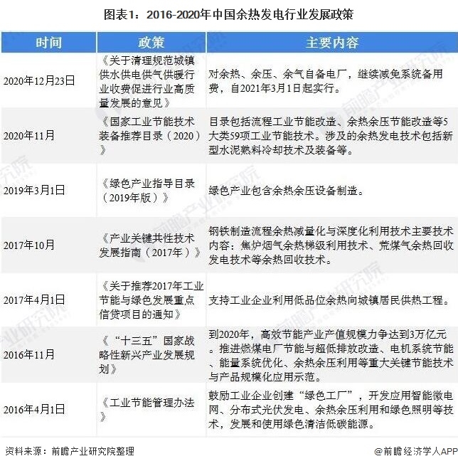 2020年發(fā)布的《關(guān)于清理規(guī)范城鎮(zhèn)供水供電供氣供暖行業(yè)收費(fèi)促進(jìn)行業(yè)高質(zhì)量發(fā)展的意見》和《國家工業(yè)節(jié)能技術(shù)裝備推薦目錄(2020)》分別從費(fèi)用減免與技術(shù)推薦的角度推動(dòng)余熱發(fā)電行業(yè)發(fā)展。
