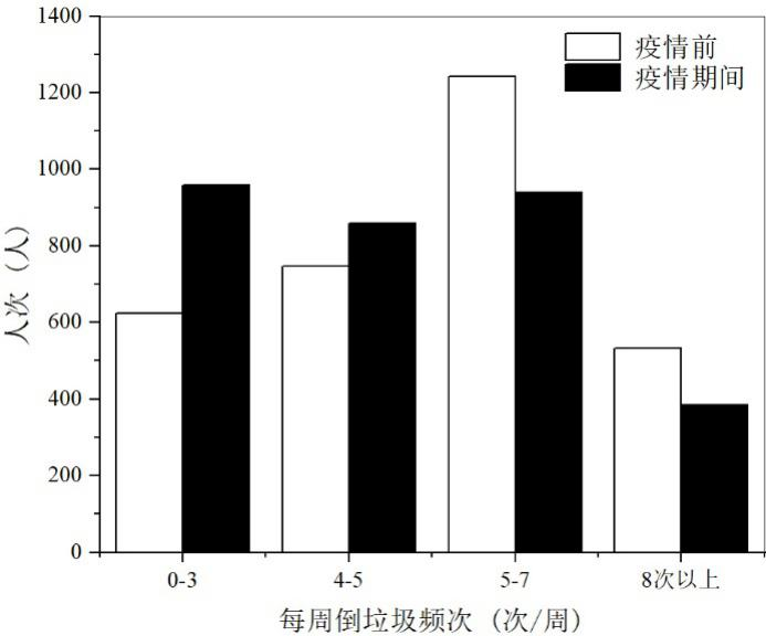 疫情導(dǎo)致社區(qū)垃圾分類基礎(chǔ)成分產(chǎn)生明顯變化,廢棄口罩大量增加,居民投放垃圾頻次顯著降低。疫情期間,人均廢棄口罩產(chǎn)生頻次約為3.7個/周,將近一半(48.2%)被調(diào)查者平均每周產(chǎn)生廢棄口罩?jǐn)?shù)量在0~3個范圍;30.6%居民投放垃圾頻率降低,由疫情前5~7次向疫情期間低頻段轉(zhuǎn)變趨勢明顯,疫情越嚴(yán)重地區(qū)口罩產(chǎn)頻更高、投放垃圾頻率降低更多。針對垃圾組分變化,社區(qū)應(yīng)貫徹落實垃圾分類,對涉疫垃圾分類分流收集處置,并靈活調(diào)整疫情期間垃圾清運計劃,總結(jié)居民行為規(guī)律,適時調(diào)減清運頻次降低成本。