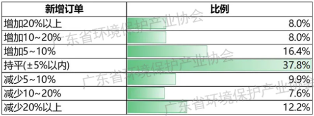 新增訂單方面,32.4%的環(huán)保企業(yè)認(rèn)為較去年同期增加,37.8%的企業(yè)同比基本持平,29.8%的企業(yè)反映新增訂單減少。