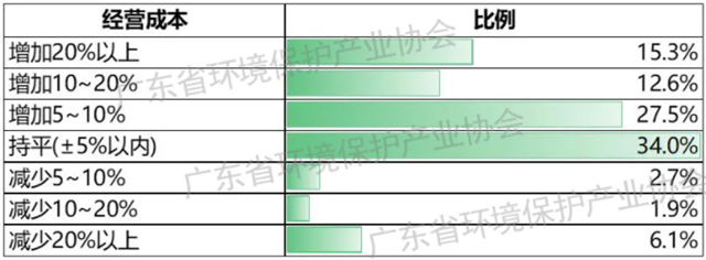 經(jīng)營(yíng)成本方面,環(huán)保企業(yè)經(jīng)營(yíng)成本普遍上升。調(diào)查企業(yè)中,53.8%的環(huán)保企業(yè)反饋成本同比上升,34.4%的環(huán)保企業(yè)基本持平,僅有11.8%的企業(yè)反饋成本下降。