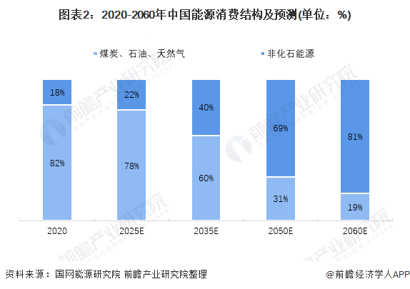 據(jù)國網(wǎng)能源研究院預(yù)測,至2035年,我國化石能源消費(fèi)量占比將下降至60%;至2060年,化石能源消費(fèi)量占比將下降至19%。而以新能源及可再生能源為主的非化石能源消耗比重將從2020年的18%提升至2060年的81%。