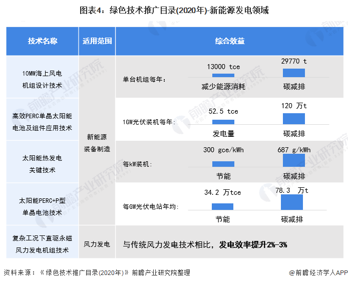 在發(fā)展重點(diǎn)方面,根據(jù)《綠色技術(shù)推廣目錄(2020年)》及相關(guān)規(guī)劃,風(fēng)能、太陽能發(fā)電技術(shù)是新能源發(fā)電技術(shù)的發(fā)展重點(diǎn),其中,有2項(xiàng)風(fēng)電技術(shù)入選《目錄》,有3項(xiàng)太陽能發(fā)電技術(shù)入選《目錄》,每項(xiàng)技術(shù)的節(jié)能、碳減排效益如下: