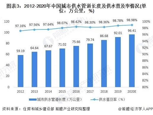 2019年我國城市供水管道長度達(dá)92.01萬公里,供水普及率達(dá)98.78%,2020年,我國城市供水管道長度約為96.41萬公里,供水普及率約為98.98%。