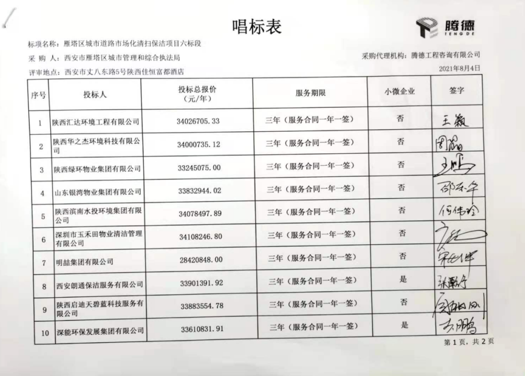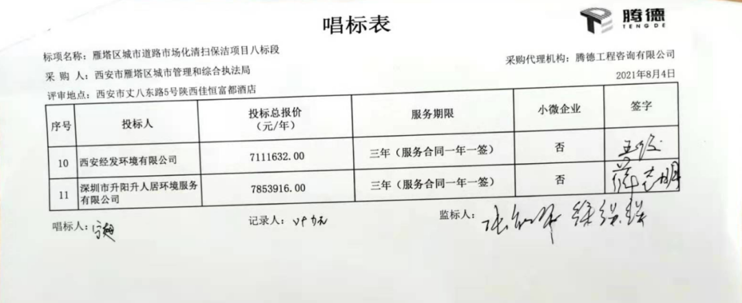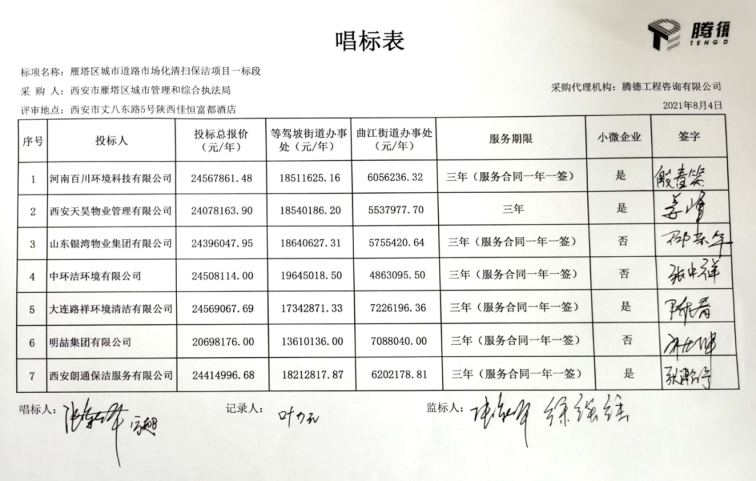 七標(biāo)段共有10家投標(biāo)企業(yè)參與報價,西安天天清洗有限責(zé)任公司勝出,成交價27,646,852元/年,服務(wù)期3年。