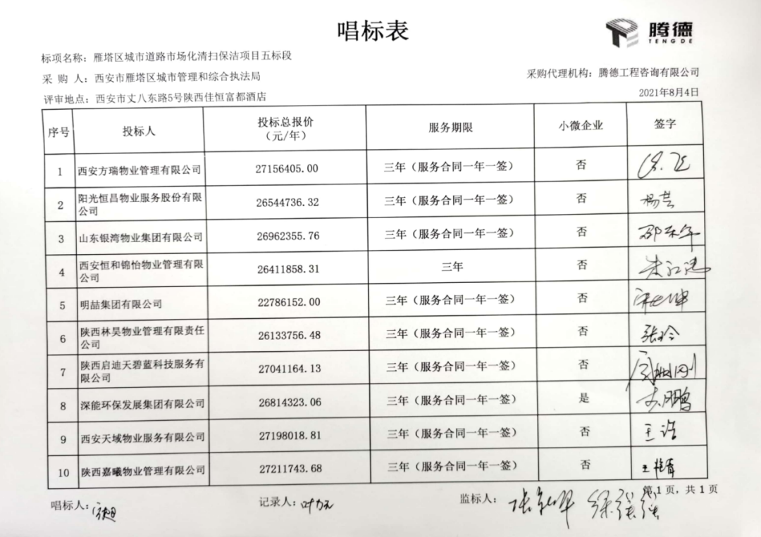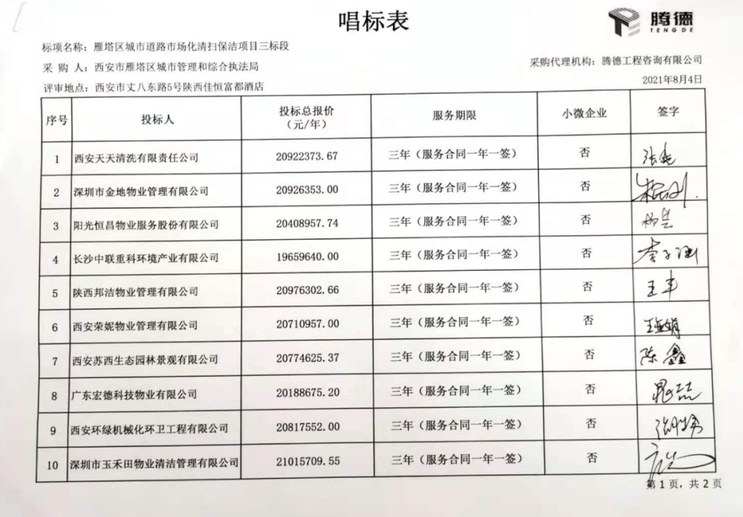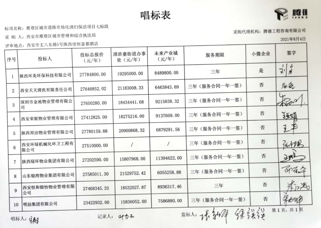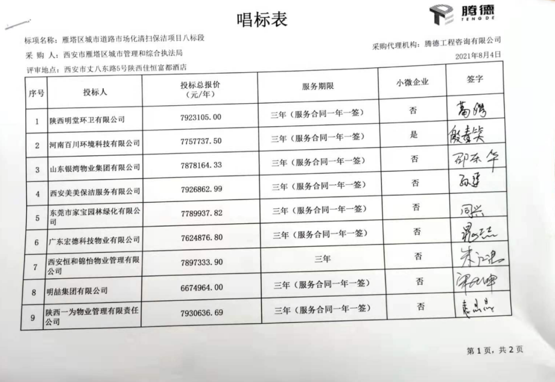 附:西安市雁塔區(qū)城市道路市場化清掃保潔項目開標(biāo)情況