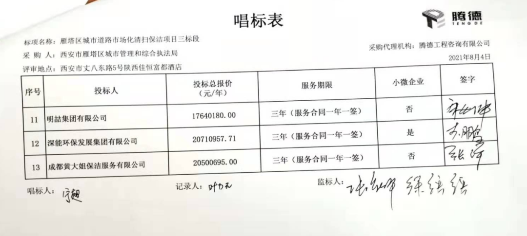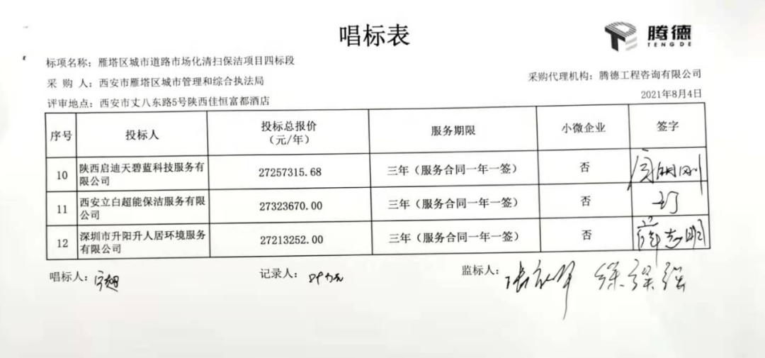 四標(biāo)段共有12家投標(biāo)企業(yè)參與報價,西安德潤環(huán)境有限公司勝出,成交價27,269,988元/年,服務(wù)期3年。