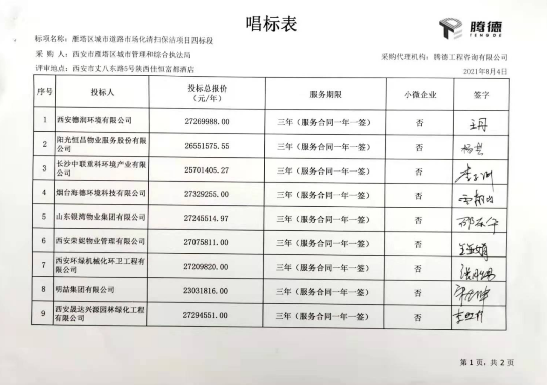 二標(biāo)段共有5家投標(biāo)企業(yè)參與報價,西安易之順物業(yè)管理有限公司勝出,成交價19,092,720元/年,服務(wù)期3年。