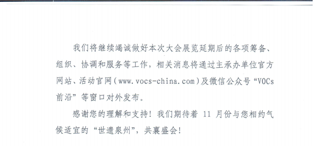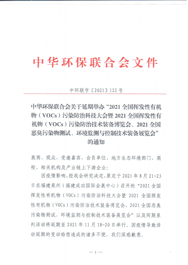 因近期國(guó)內(nèi)疫情防控形勢(shì)趨于嚴(yán)峻,環(huán)保在線記者從中華環(huán)保聯(lián)合會(huì)獲悉,為切實(shí)保障嘉賓、展商和觀眾的身體健康,經(jīng)主辦單位研究決定,原定于2021年8月21-23日在福建泉州(福建成功國(guó)際會(huì)展中心)召開的“2021全國(guó)揮發(fā)性有機(jī)物(VOCs)污染防治科技大會(huì)暨2021全國(guó)揮發(fā)性有機(jī)物(VOCs)污染防治技術(shù)裝備博覽會(huì)、2021全國(guó)惡臭污染物測(cè)試、環(huán)境監(jiān)測(cè)與控制技術(shù)裝備展覽會(huì)”以及同期系列活動(dòng)將延期至2021年11月18-20日舉行,活動(dòng)地點(diǎn)不變。相關(guān)消息將通過(guò)主承辦單位網(wǎng)站、活動(dòng)及微信公眾號(hào)“VOCs前沿”、戰(zhàn)略合作媒體“環(huán)保在線”等窗口對(duì)外發(fā)布。