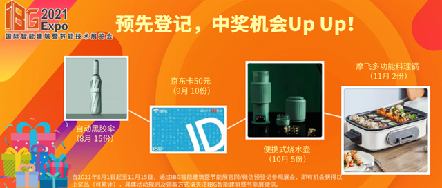 據(jù)悉,“IBG國際智能建筑暨節(jié)能技術(shù)展覽會”觀眾預(yù)登記已開啟,自8月開始至11月預(yù)登記的觀眾有機會享自動黑膠傘、京東卡、便攜式燒水壺、摩飛多功能料理鍋等實用好禮!活動獎品可累計,越早登記中獎機會越多。主辦方期待于2021年11月30日-12月2日與更多業(yè)內(nèi)人士相聚上海新國際博覽中心,共筑智能建筑生態(tài)圈!