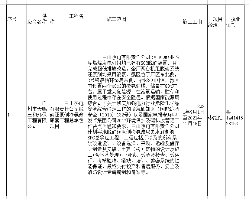 原標(biāo)題:白山熱電有限責(zé)任公司脫硝還原劑液氨改尿素工程總承包項(xiàng)目中標(biāo)公告