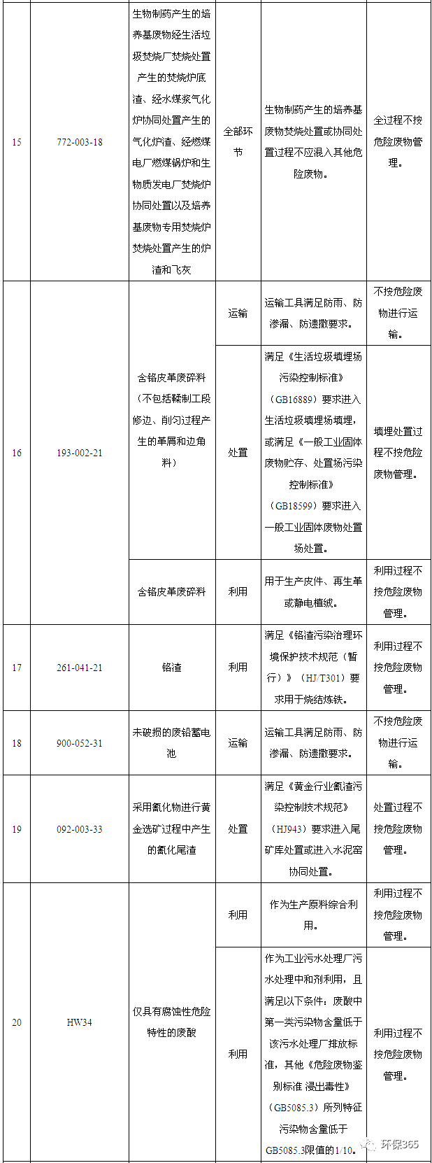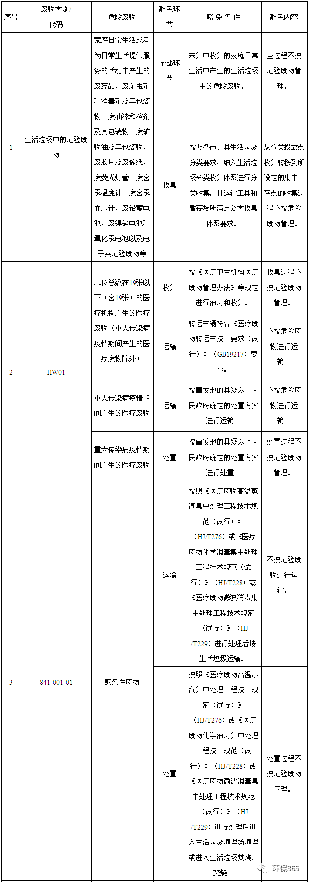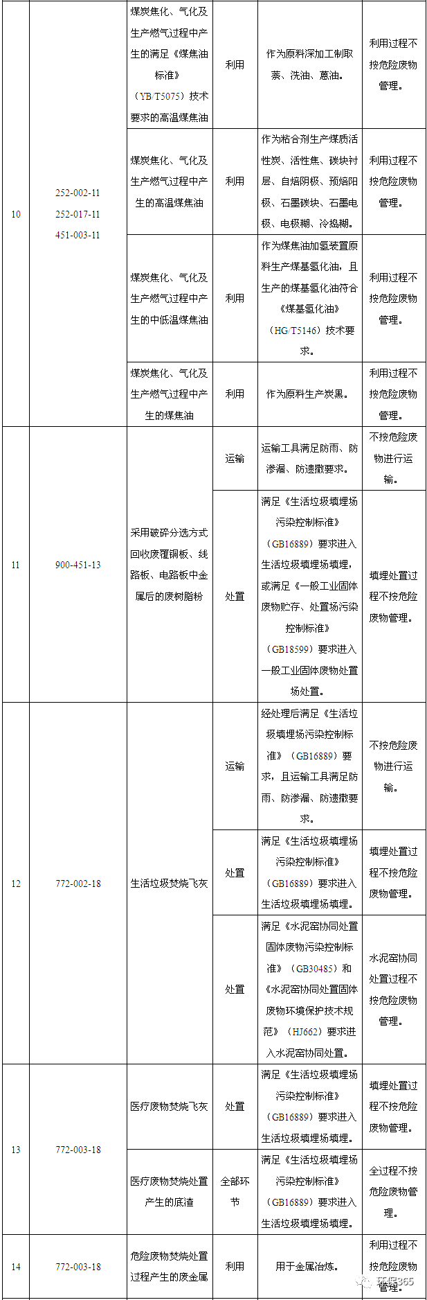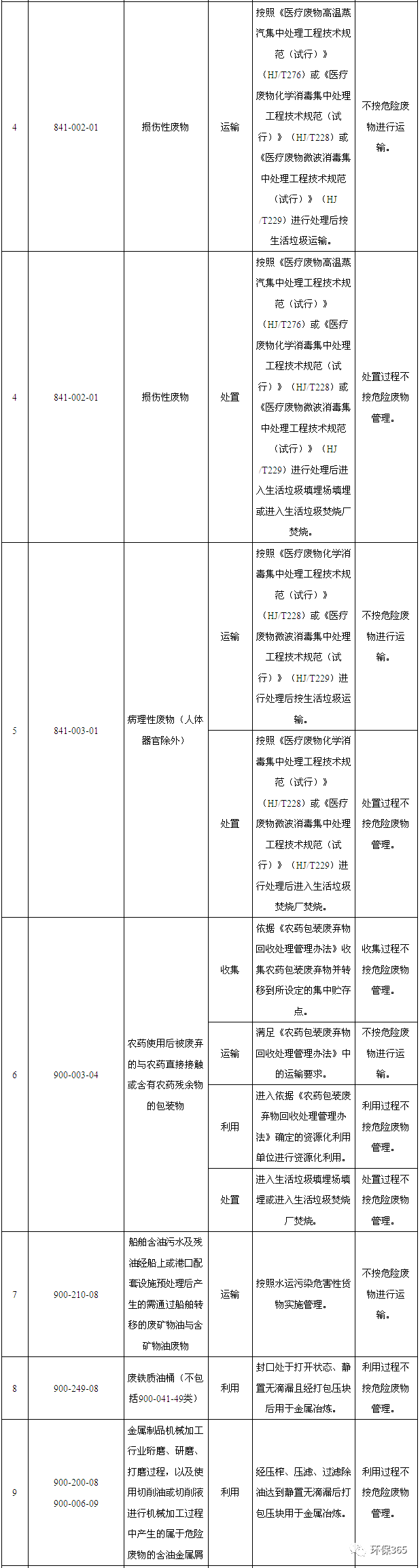 (1)家庭日常生活或者為日常生活提供服務的活動中產(chǎn)生的廢藥品、廢殺蟲劑和消毒劑及其包裝物、廢油漆和溶劑及其包裝物、廢礦物油及其包裝物、廢膠片及廢像紙、廢熒光燈管、廢含汞溫度計、廢含汞血壓計、廢鉛蓄電池、廢鎳鎘電池和氧化汞電池以及電子類危險廢物等未經(jīng)過集中收集的全部環(huán)節(jié)不按危險廢物管理;按照各市、縣生活垃圾分類要求,納入生活垃圾分類收集體系進行分類收集,且運輸工具和暫存場所滿足分類收集體系要求的,從分類投放點收集轉(zhuǎn)移到所設定的集中貯存點的收集過程不按危險廢物管理。(2)床位總數(shù)在19張以下(含19張)的醫(yī)療機構產(chǎn)生的醫(yī)療廢物(重大傳染病疫情期間產(chǎn)生的醫(yī)療廢物除外)按《醫(yī)療衛(wèi)生機構醫(yī)療廢物管理辦法》等規(guī)定進行消毒和收集的,收集過程不按危險廢物管理;轉(zhuǎn)運車輛符合《醫(yī)療廢物轉(zhuǎn)運車技術要求(試行)》(GB19217)要求的,不按危險廢物進行運輸;重大傳染病疫情期間產(chǎn)生的醫(yī)療廢物,按事發(fā)地的縣級以上人民政府確定的處置方案進行運輸?shù)模话次kU廢物進行運輸;按事發(fā)地的縣級以上人民政府確定的處置方案進行處置的,處置過程不按危險廢物管理。(3)感染性廢物按照《醫(yī)療廢物高溫蒸汽集中處理工程技術規(guī)范(試行)》(HJ/T276)或《醫(yī)療廢物化學消毒集中處理工程技術規(guī)范(試行)》(HJ/T228)或《醫(yī)療廢物微波消毒集中處理工程技術規(guī)范(試行)》(HJ/T229)進行處理后按生活垃圾運輸?shù)模话次kU廢物進行運輸;按照《醫(yī)療廢物高溫蒸汽集中處理工程技術規(guī)范(試行)》(HJ/T276)或《醫(yī)療廢物化學消毒集中處理工程技術規(guī)范(試行)》(HJ/T228)或《醫(yī)療廢物微波消毒集中處理工程技術規(guī)范(試行)》(HJ/T229)進行處理后進入生活垃圾填埋場填埋或進入生活垃圾焚燒廠焚燒的,處置過程不按危險廢物管理。(4)損傷性廢物按照《醫(yī)療廢物高溫蒸汽集中處理工程技術規(guī)范(試行)》(HJ/T276)或《醫(yī)療廢物化學消毒集中處理工程技術規(guī)范(試行)》(HJ/T228)或《醫(yī)療廢物微波消毒集中處理工程技術規(guī)范(試行)》(HJ/T229)進行處理后按生活垃圾運輸?shù)模话次kU廢物進行運輸;按照《醫(yī)療廢物高溫蒸汽集中處理工程技術規(guī)范(試行)》(HJ/T276)或《醫(yī)療廢物化學消毒集中處理工程技術規(guī)范(試行)》(HJ/T228)或《醫(yī)療廢物微波消毒集中處理工程技術規(guī)范(試行)》(HJ/T229)進行處理后進入生活垃圾填埋場填埋或進入生活垃圾焚燒廠焚燒的,處置過程不按危險廢物管理。(5)病理性廢物(人體器官除外)按照《醫(yī)療廢物化學消毒集中處理工程技術規(guī)范(試行)》(HJ/T228)或《醫(yī)療廢物微波消毒集中處理工程技術規(guī)范(試行)》(HJ/T229)進行處理后按生活垃圾運輸?shù)模话次kU廢物進行運輸;按照《醫(yī)療廢物化學消毒集中處理工程技術規(guī)范(試行)》(HJ/T228)或《醫(yī)療廢物微波消毒集中處理工程技術規(guī)范(試行)》(HJ/T229)進行處理后進入生活垃圾焚燒廠焚燒的,處置過程不按危險廢物管理。(6)農(nóng)藥使用后被廢棄的與農(nóng)藥直接接觸或含有農(nóng)藥殘余物的包裝物依據(jù)《農(nóng)藥包裝廢棄物回收處理管理辦法》收集并轉(zhuǎn)移到所設定的集中貯存點的,收集過程不按危險廢物管理;滿足《農(nóng)藥包裝廢棄物回收處理管理辦法》中的運輸要求的,不按危險廢物進行運輸;進入依據(jù)《農(nóng)藥包裝廢棄物回收處理管理辦法》確定的資源化利用單位進行資源化利用的,利用過程不按危險廢物管理;進入生活垃圾填埋場填埋或進入生活垃圾焚燒廠焚燒的,處置過程不按危險廢物管理。(7)船舶含油污水及殘油經(jīng)船上或港口配套設施預處理后產(chǎn)生的需通過船舶轉(zhuǎn)移的廢礦物油與含礦物油廢物按照水運污染危害性貨物實施管理的,不按危險廢物進行運輸。(8)廢鐵質(zhì)油桶(不包括900-041-49類)封口處于打開狀態(tài)、靜置無滴漏且經(jīng)打包壓塊后用于金屬冶煉的,利用過程不按危險廢物管理。(9)金屬制品機械加工行業(yè)珩磨、研磨、打磨過程,以及使用切削油或切削液進行機械加工過程中產(chǎn)生的屬于危險廢物的含油金屬屑經(jīng)壓榨、壓濾、過濾除油達到靜置無滴漏后打包壓塊用于金屬冶煉的,利用過程不按危險廢物管理。(10)煤炭焦化、氣化及生產(chǎn)燃氣過程中產(chǎn)生的滿足《煤焦油標準》(YB/T5075)技術要求的高溫煤焦油作為原料深加工制取萘、洗油、蒽油的,利用過程不按危險廢物管理。煤炭焦化、氣化及生產(chǎn)燃氣過程中產(chǎn)生的高溫煤焦油作為粘合劑生產(chǎn)煤質(zhì)活性炭、活性焦、碳塊襯層、自焙陰極、預焙陽極、石墨碳塊、石墨電極、電極糊、冷搗糊的,利用過程不按危險廢物管理。煤炭焦化、氣化及生產(chǎn)燃氣過程中產(chǎn)生的中低溫煤焦油作為煤焦油加氫裝置原料生產(chǎn)煤基氫化油,且生產(chǎn)的煤基氫化油符合《煤基氫化油》(HG/T5146)技術要求的,利用過程不按危險廢物管理。煤炭焦化、氣化及生產(chǎn)燃氣過程中產(chǎn)生的煤焦油作為原料生產(chǎn)炭黑的,利用過程不按危險廢物管理。(11)采用破碎分選方式回收廢覆銅板、線路板、電路板中金