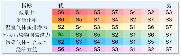 資源化率為資源化產(chǎn)品的產(chǎn)出量。S6處理技術(shù)資源利用率高、有機(jī)肥產(chǎn)品市場(chǎng)大而且具有最高的盈利能力。S4的資源產(chǎn)品主要是有機(jī)酸性土壤改良劑和有機(jī)肥料,具有很好的土壤改良和施肥效果。