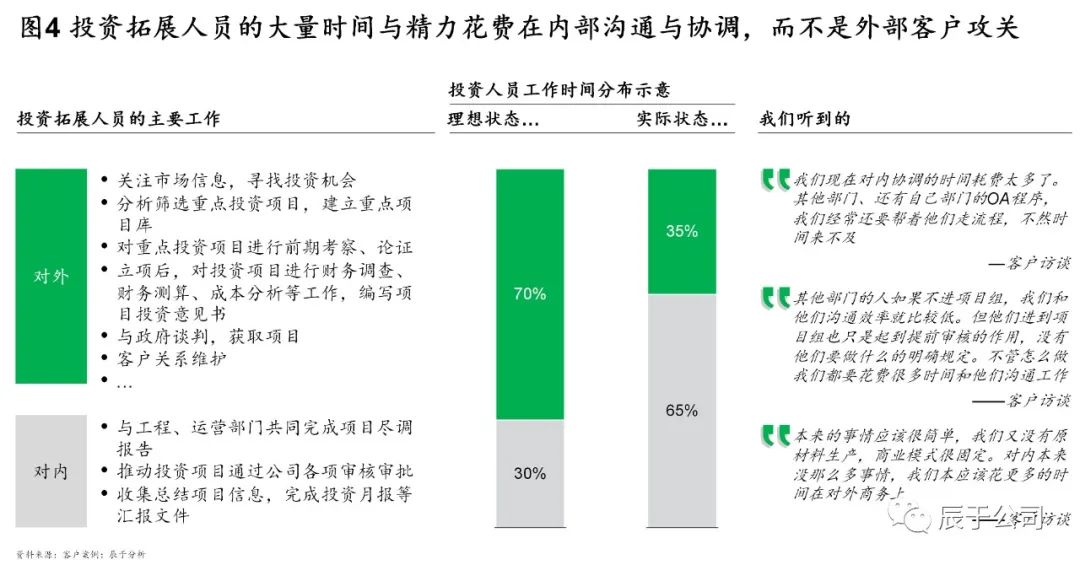 理想狀態(tài)下,對(duì)外對(duì)內(nèi)工作的時(shí)間分配比例應(yīng)該是7:3,甚至更高也不為過(guò),但現(xiàn)實(shí)往往相反,由于內(nèi)部協(xié)同效率不高、流程繁冗、“人治”問(wèn)題嚴(yán)重,我們發(fā)現(xiàn)一些投資拓展人員更多的時(shí)間與精力花費(fèi)在內(nèi)部溝通與協(xié)調(diào),而不是外部客戶(hù)攻關(guān)(見(jiàn)圖4)。造成這種現(xiàn)象的原因,表面看上去是內(nèi)部流程繁瑣,決策鏈條冗長(zhǎng),實(shí)則是內(nèi)部沒(méi)有形成一以貫之以市場(chǎng)為導(dǎo)向、以項(xiàng)目為核心的理念文化。平時(shí)大多只是喊喊口號(hào)而已,并未真正付諸行動(dòng)。