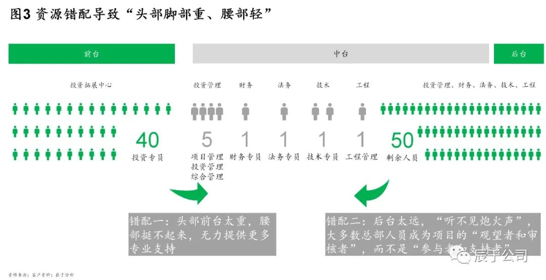 不難發(fā)現(xiàn),近年來(lái)一些企業(yè)開(kāi)始“招兵買(mǎi)馬”,大量招聘投資拓展人員,這對(duì)于企業(yè)提高投資拓展能力自然是好事。不過(guò)我們也注意到,一些企業(yè)在投資相關(guān)的人員配置上卻不盡合理:他們通常把大量投資拓展人員“撒在前線(xiàn)”,同時(shí)建立“大后臺(tái)”,與投資相關(guān)的投管、財(cái)務(wù)、法務(wù),甚至技術(shù)、工程、運(yùn)營(yíng)等人員主要負(fù)責(zé)項(xiàng)目質(zhì)量把關(guān)和風(fēng)險(xiǎn)管控,只有少量人員在中臺(tái)為前臺(tái)提供“彈藥”和支持(見(jiàn)圖3)。這種“頭重腳重”帶來(lái)兩個(gè)“錯(cuò)配”,一是頭部前臺(tái)太重,腰部挺不起來(lái),無(wú)力提供更多專(zhuān)業(yè)支持;二是腳部后臺(tái)太遠(yuǎn),“聽(tīng)不見(jiàn)炮火聲”,大多數(shù)人成為項(xiàng)目的“觀望者和審核者”,而不是“參與者和支持者”。