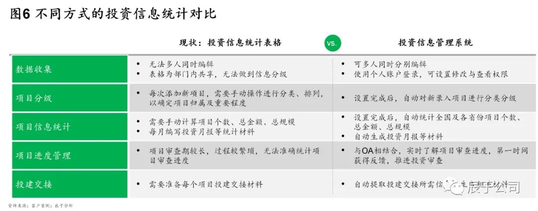 此外,我國(guó)生態(tài)環(huán)保產(chǎn)業(yè)數(shù)字化滲透率尚處于較低水平,即使是頭部企業(yè),也僅是在財(cái)務(wù)、行政、人力資源、工程等條線(xiàn)進(jìn)行了IT系統(tǒng)建設(shè),投資管理的IT系統(tǒng)建設(shè)很少,更別提利用大數(shù)據(jù)、機(jī)器學(xué)習(xí)、人工智能等先進(jìn)技術(shù)為投資決策提供支持了,不管是數(shù)據(jù)收集、還是項(xiàng)目分級(jí)、信息統(tǒng)計(jì)、進(jìn)度管理、投建交接等工作,基本依靠手動(dòng)操作,效率低下且容易出錯(cuò)(見(jiàn)圖6)。