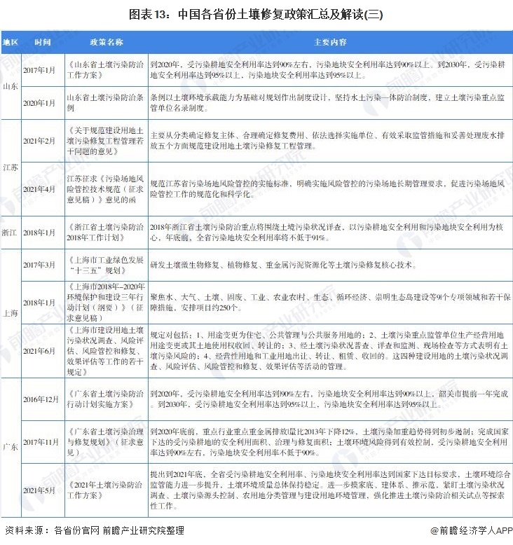 未來10年,我國主要省份也提出了土壤修復的發(fā)展目標。廣東省提出短期2021年土壤修復目標,北京、福建提出了到2025年土壤修復的目標,例如北京提出到2025年,再開發(fā)利用的污染地塊安全利用率達到92%以上,受污染耕地安全利用率達到92%以上。而安徽、山東、河南、廣西、陜西、甘肅等省份提出至2030年的土壤修復目標,例如安徽省指出到2030年,受污染耕地安全利用率達到95%以上,污染地塊安全利用率達到95%以上。