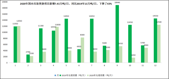 圖四:2020年國(guó)內(nèi)垃圾焚燒項(xiàng)目中標(biāo)新增7.43萬噸/日產(chǎn)能▼