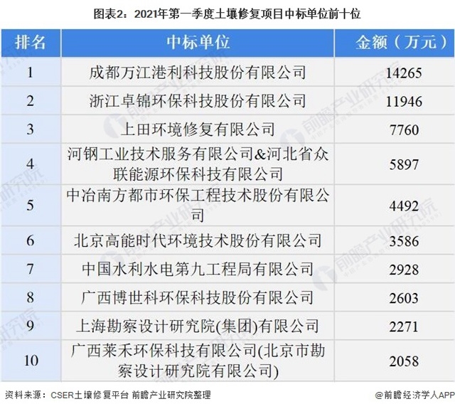 土壤修復行業(yè)屬于技術密集型和資金密集型行業(yè),技術水平是行業(yè)內(nèi)企業(yè)的主要核心競爭力。行業(yè)涉及環(huán)境、土壤、水文、地質、生態(tài)、生物、材料、物理、化學等多學科、多領域的知識和技術,具有較高的技術門檻。而“全能型”企業(yè)可進行污染場地調(diào)查、風險評估、修復施工等,業(yè)務基本覆蓋土壤修復各個環(huán)節(jié),更具競爭優(yōu)勢,成為行業(yè)發(fā)展的最大受益者。按照中標金額,2021年一季度土壤修復項目中標單位排名前十單位如下表所示。