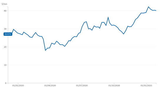歐盟碳市場的穩(wěn)定結(jié)構(gòu)框架以及歐盟內(nèi)部長期政策的合理性在2020年的運(yùn)行中得到較好體現(xiàn)。2020年是歐盟碳市場第三階段運(yùn)行的最后一年,也是第四交易階段的密集準(zhǔn)備階段,碳價(jià)格在3、4月有短期大幅下降,從年初最高29.68美元降至4月最低18.04美元,但5月后價(jià)格又逐漸回升,并在7月達(dá)到33.89美元,此后一直在30美元左右徘徊,最后在同年12月達(dá)到42.16美元。在未來,歐盟《綠色新政》一攬子復(fù)蘇計(jì)劃以及《歐盟氣候法》中包含的2030年的新目標(biāo)將催生更大的氣候雄心,而碳市場的優(yōu)化改革將有助于實(shí)現(xiàn)這些氣候目標(biāo)。