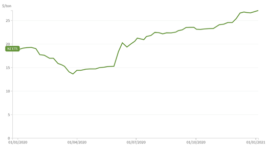 碳價(jià)格方面,新冠肺炎疫情期間,受制于經(jīng)濟(jì)緩滯,新西蘭碳配額價(jià)格從2020年1月的18.83美元降至3月14.35美元,后續(xù)逐步回升至年底的26.78美元。表明市場投資者意識到隨著碳排放上限的設(shè)定、固定價(jià)格期權(quán)的取消,碳市場需求將會進(jìn)一步提升。