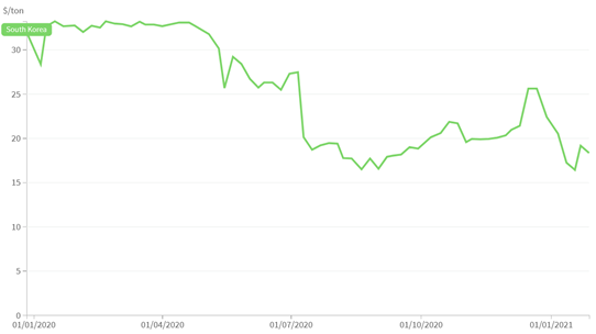 近兩年在韓國碳市場中,碳價(jià)持續(xù)處于波動狀態(tài)。2020年是韓國碳市場(K-ETS)運(yùn)行第二階段的最后一年,受新冠疫情影響, 2020年的價(jià)格波動更加劇烈。碳價(jià)格在2020年4月初達(dá)到頂峰(35.92美元),然后從5月開始大幅下降至16.95美元,8月開始反彈至12月初達(dá)到25.84美元,12月末又有所回落(19.49美元)。2020年9月,韓國總統(tǒng)文在寅宣布將在2050年之前實(shí)現(xiàn)凈零排放的長期目標(biāo),預(yù)計(jì)將在未來幾年更新氣候政策框架,促進(jìn)對低碳技術(shù)的投資。