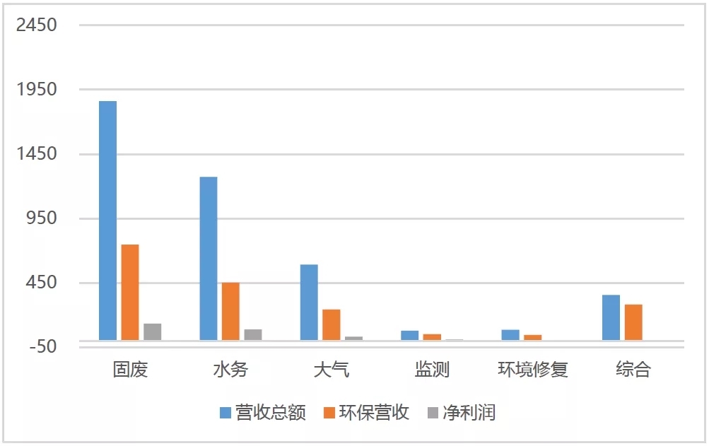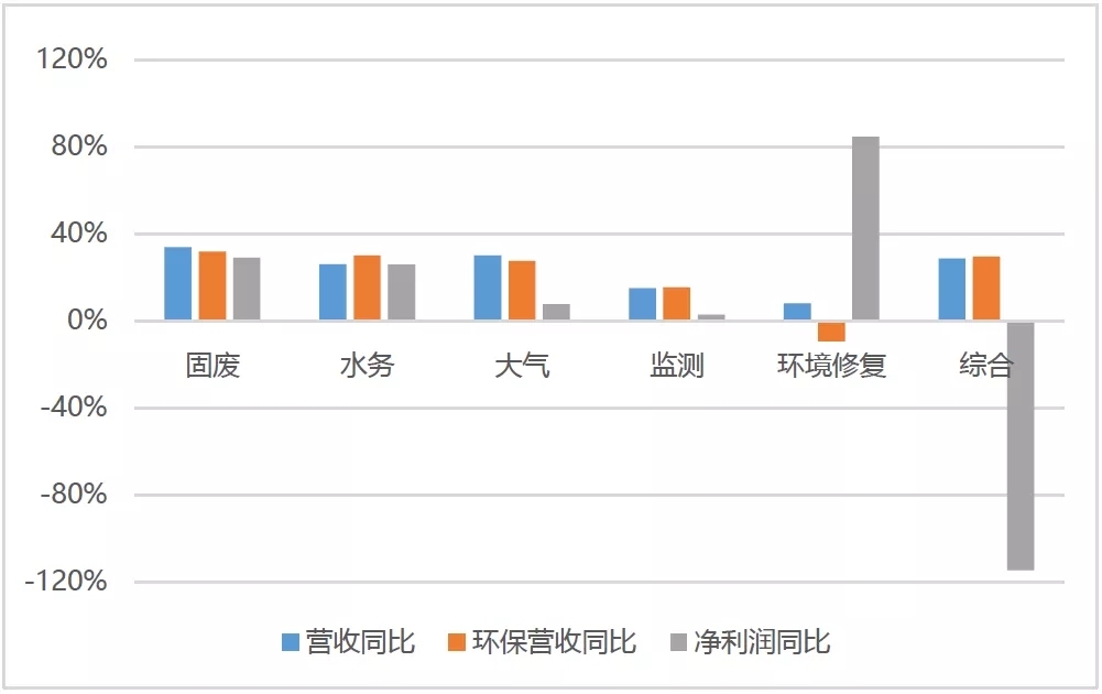 綜合服務領域,營業(yè)收入同比增長28.94%,環(huán)保營收同比增長29.6%,凈利潤下降113%,個別企業(yè)(如啟迪環(huán)境、東方園林)虧損額度較大。