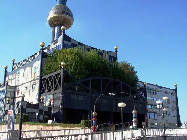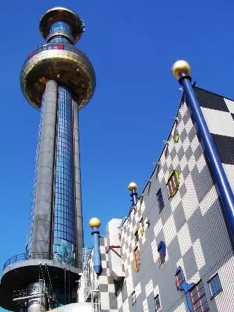 景觀設(shè)計(jì):這座建筑物是奧地利有名的藝術(shù)家、建筑設(shè)計(jì)師百水先生的杰作。工程從1988年至1992年進(jìn)行了四年建成。居民遠(yuǎn)遠(yuǎn)就可以看見一個(gè)高高聳立的大煙囪,中部有一個(gè)碩大的金色球體,在藍(lán)天下格外醒目。這金色的圓形球體會(huì)讓人聯(lián)想到某明珠電視塔的旋轉(zhuǎn)餐廳,其實(shí)不然。這就是垃圾焚燒廠的控制室。色彩斑斕而充滿童趣的外墻立面,讓人感覺就像是一座童話城堡。 外墻面上隨意涂抹的卡通畫,有的是各種色彩的水果,有的是各種性能的用具,煞是可愛。