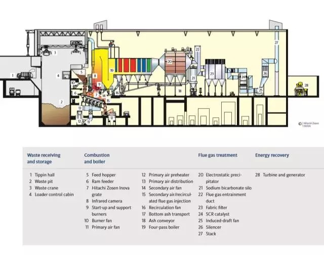 工藝:下圖是電廠工作原理的示意圖,通過這個(gè)示意圖可以看到,那些超級(jí)樹的管狀物,都是垃圾焚燒廠的排氣管道。