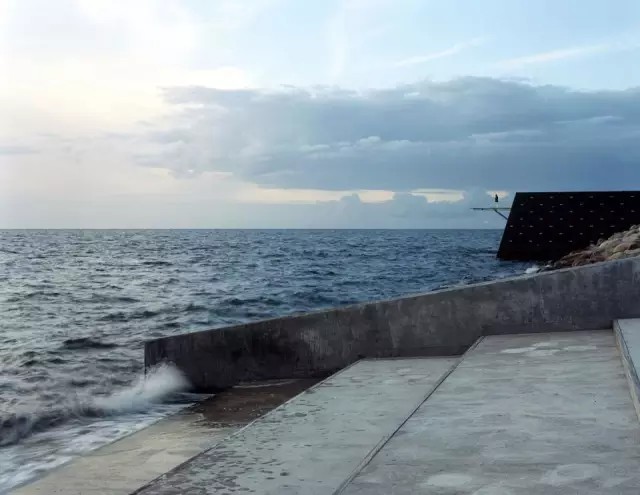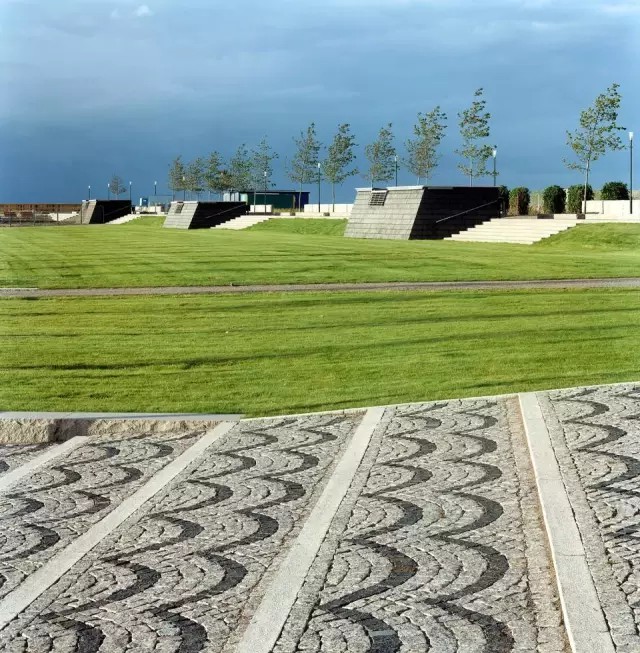 Dania濱海公園位于瑞典和丹麥分界處的?resund海峽一側(cè)。該公園是原馬爾默海岸西部港口改造工程的主要項(xiàng)目之一,也是瑞典國內(nèi)對(duì)城市用地進(jìn)行開發(fā)再利用的最為雄心勃勃的項(xiàng)目之一。該用地曾經(jīng)是寸草不生的垃圾填埋場(chǎng);是一片充斥著臟污不堪的淤泥的工業(yè)荒漠。起初,難以定義的基地條件給設(shè)計(jì)師帶來了不小的困難,最終那些自然的瞬息萬變的元素反而構(gòu)成了設(shè)計(jì)的主角:光、風(fēng)、大海、地面線以及一望無際的遠(yuǎn)景。這是一片隨季節(jié)和氣候變化的場(chǎng)所,人們?cè)谶@里可以體驗(yàn)巖石的堅(jiān)硬與海浪的兇悍,體驗(yàn)落日的壯美與夏日的明媚。公園最重要的組成要素是被稱為“Scouts(瞭望臺(tái))”的部分:三個(gè)傾斜的混凝土臺(tái),嵌入到巖石組成的海岸線中,讓來到公園的人們可以深入大海。40X40m的被稱為“堡壘”的平臺(tái),比海平面高6m,無論是強(qiáng)烈的海風(fēng)還是壯美的落日,只要站在這里都能暢快地體驗(yàn)。此外,三個(gè)木箱組成的“陽臺(tái)”提供了俯瞰廣闊草坪的場(chǎng)所。后者是一塊絕佳的室外活動(dòng)場(chǎng)地,兩排高地錯(cuò)落的樹木及耐鹽灌木將強(qiáng)烈的海風(fēng)阻隔在外。