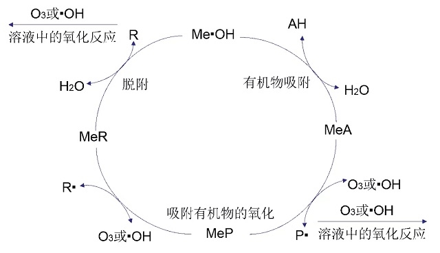 臭氧催化氧化技術(shù)可以解決臭氧氧化過程中臭氧利用效率低、礦化能力低以及污染物分解不徹底等問題。在常溫常壓下,臭氧通過催化劑的作用促進(jìn)分解并產(chǎn)生羥基自由基(·OH),將難以用臭氧單獨(dú)氧化或者臭氧氧化分解不徹底的有機(jī)物進(jìn)行分解和礦化。·OH的氧化過程具有無選擇性、反應(yīng)速率高等特點(diǎn),與大多數(shù)有機(jī)物反應(yīng)時(shí)速率常數(shù)通常為106——109 M-1s-1,比臭氧與有機(jī)物的反應(yīng)速率常數(shù)高出7個(gè)數(shù)量級(jí)。