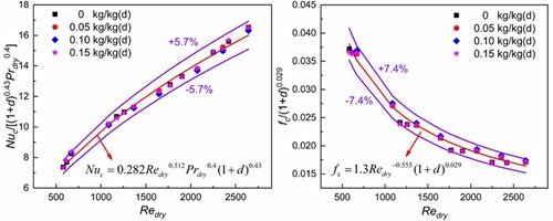 濕工質(zhì)中的含濕量顯著影響微通道回熱器的換熱性能,為了分析含濕量的定量影響,研究人員構(gòu)建了翼型-直通道新型耦合流動換熱單元三維數(shù)理模型,討論了含濕量、流量和溫度等因素對耦合換熱的影響規(guī)律,對比了翼型結(jié)構(gòu)與直通道、之字形結(jié)構(gòu)的綜合流動換熱性能。研究表明,增加含濕量可以提高高壓空氣的整體流動換熱特性;在等泵功的條件下,交錯排列的翼型翅片相比較于直通道和之字形通道具有最好的熱工水力特性。基于干工質(zhì)經(jīng)驗關聯(lián)式,引入含濕量強化換熱因子,建立了高溫含濕煙氣和高壓濕空氣流動換熱特性與含濕量的定量關聯(lián)式,定量描述了含濕量對傳熱和壓降特性的影響規(guī)律(見圖2)。