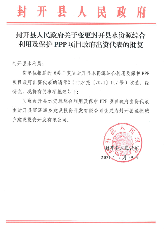 4、封開縣人民政府關(guān)于變更封開縣水資源綜合利用及保護(hù)PPP項目政府出資代表的批復(fù)