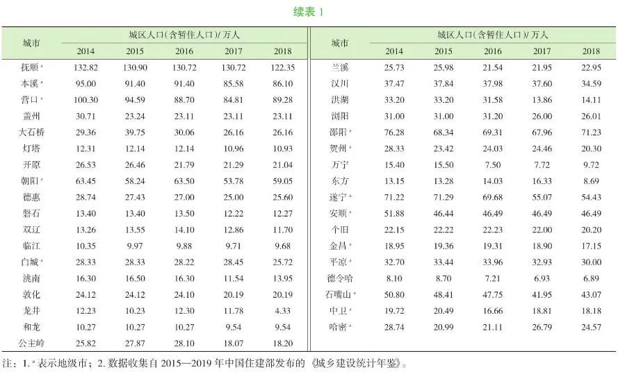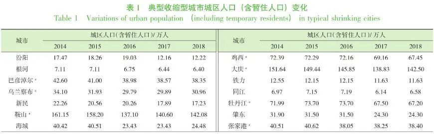 為了獲得收縮型城市的生活垃圾產(chǎn)生特征,首先對全國地級市、縣級市進行了總體分析。收縮型城市目前還缺乏統(tǒng)一定義,本研究從生活垃圾管理角度出發(fā),根據(jù)我國《城鄉(xiāng)建設(shè)統(tǒng)計年鑒》,以城區(qū)人口(含城區(qū)暫住人口)在2013—2018年間持續(xù)減少超過5%為基本衡量依據(jù)??紤]到統(tǒng)計口徑的差異,進一步參考各地的統(tǒng)計公報與年鑒,排除人口顯著流入的城市,得到典型收縮型城市共計49個,如表1~表3所示。表1~表3中,有些地級市和縣級市為隸屬關(guān)系,但這些地級市的統(tǒng)計數(shù)據(jù)均對應主城區(qū),并不包含下轄縣級市城區(qū)的人口或垃圾量。
